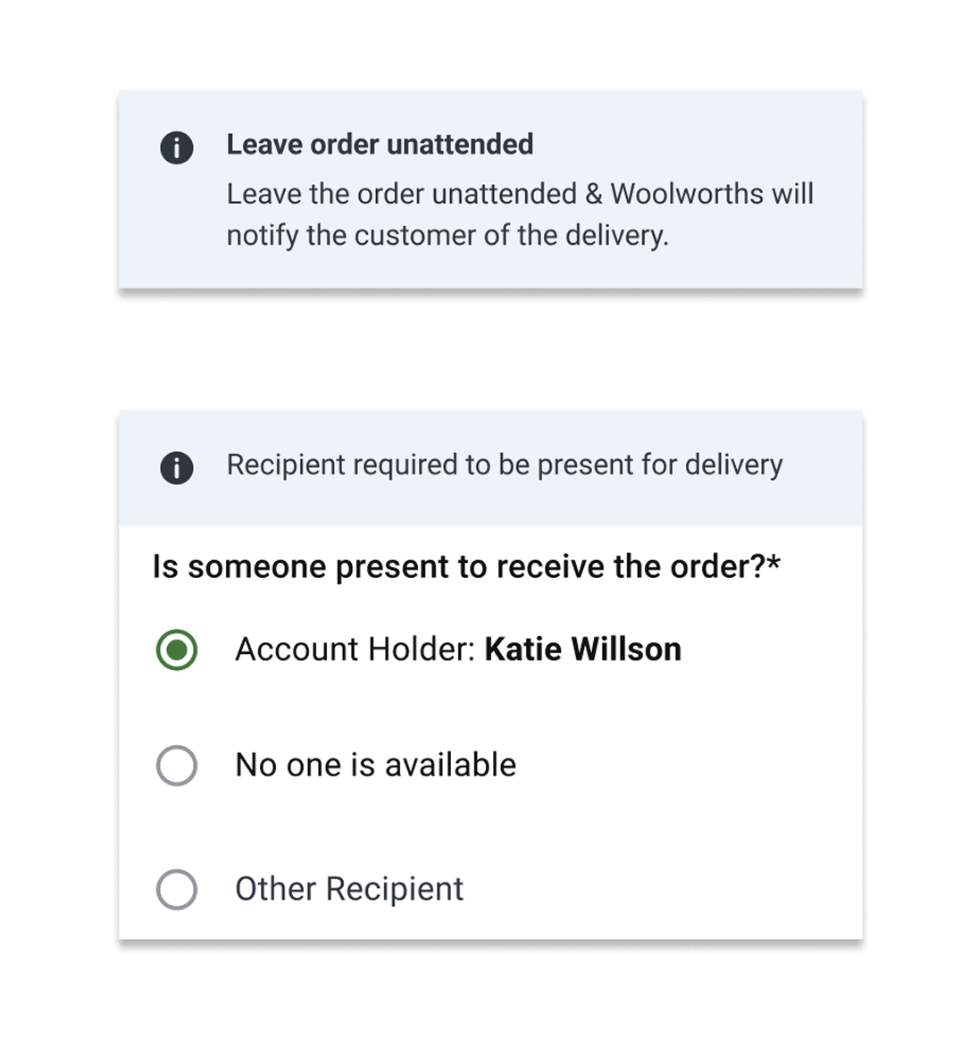 The original concept delivery requirements, for example, if the order is able to be left unattended with a pills design but this was missed by users within testing and the design was revisited and retested in a message format(pictured on the right). We also learned the area of focus for the user was toward the bottom of the screen. After re-testing, the visibility and comprehension increased significantly.