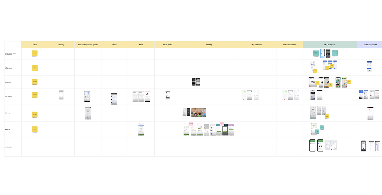 To understand how our driver app measures up against industry standards I completed feature bench marking essential features such as route optimization, real-time notifications, and dashboards across multiple apps.
