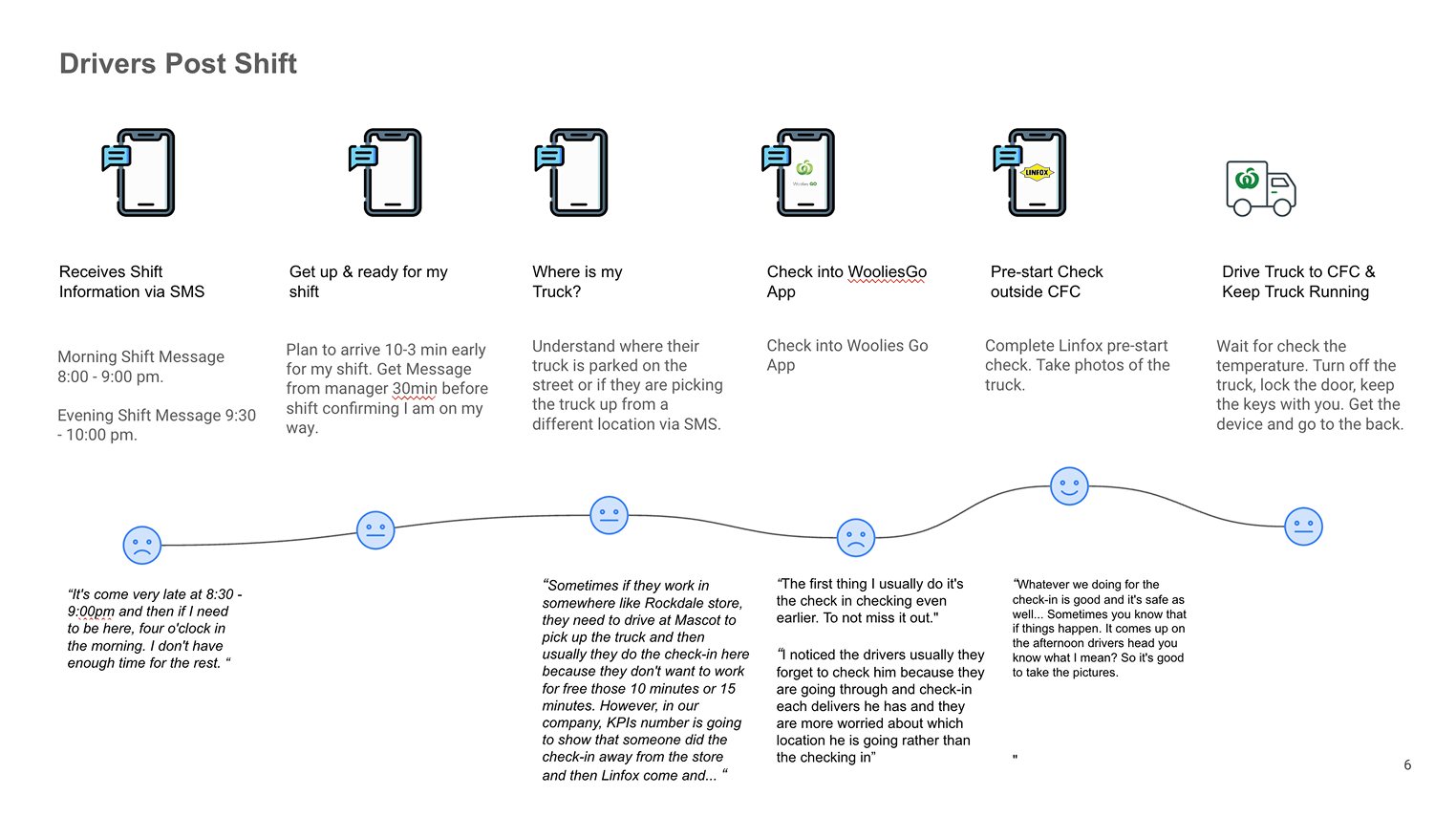 • Our review of user goals and tasks from both a Woolworth’s Delivery Driver perspective and removing unnecessary steps/screens. The predicted savings was significant and was put forward as a key benefit of the business case.